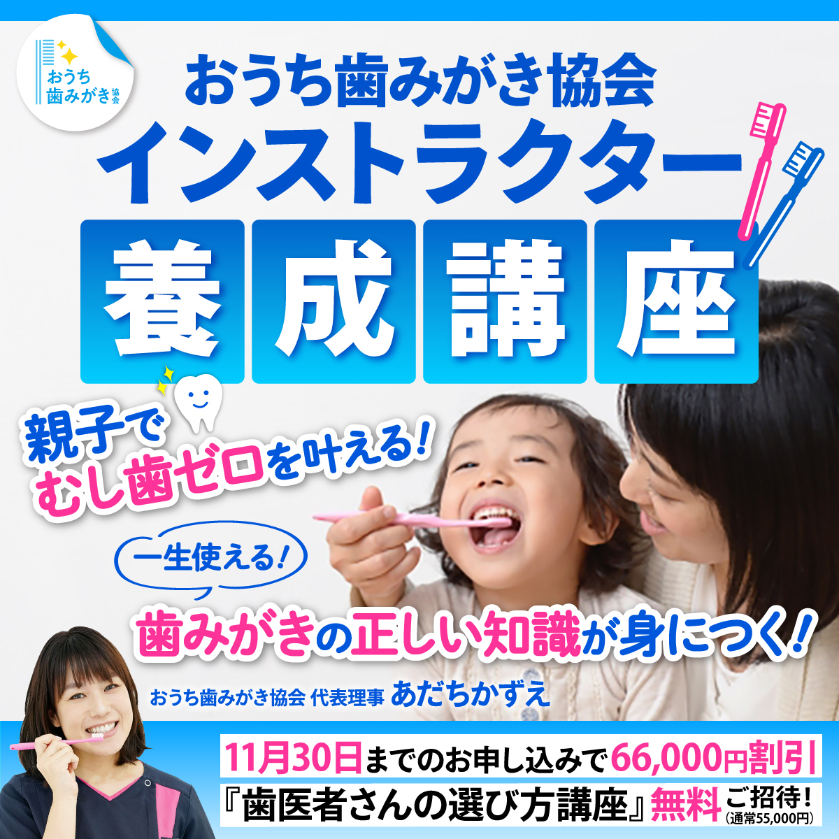 歯の基本知識と正しい歯みがきメソッドを習得することで、自分自身のお口はもちろん、家族のお口の健康もサポートすることが可能です。1家に1人、歯のスペシャリストを誕生させるのが当協会の目標です。